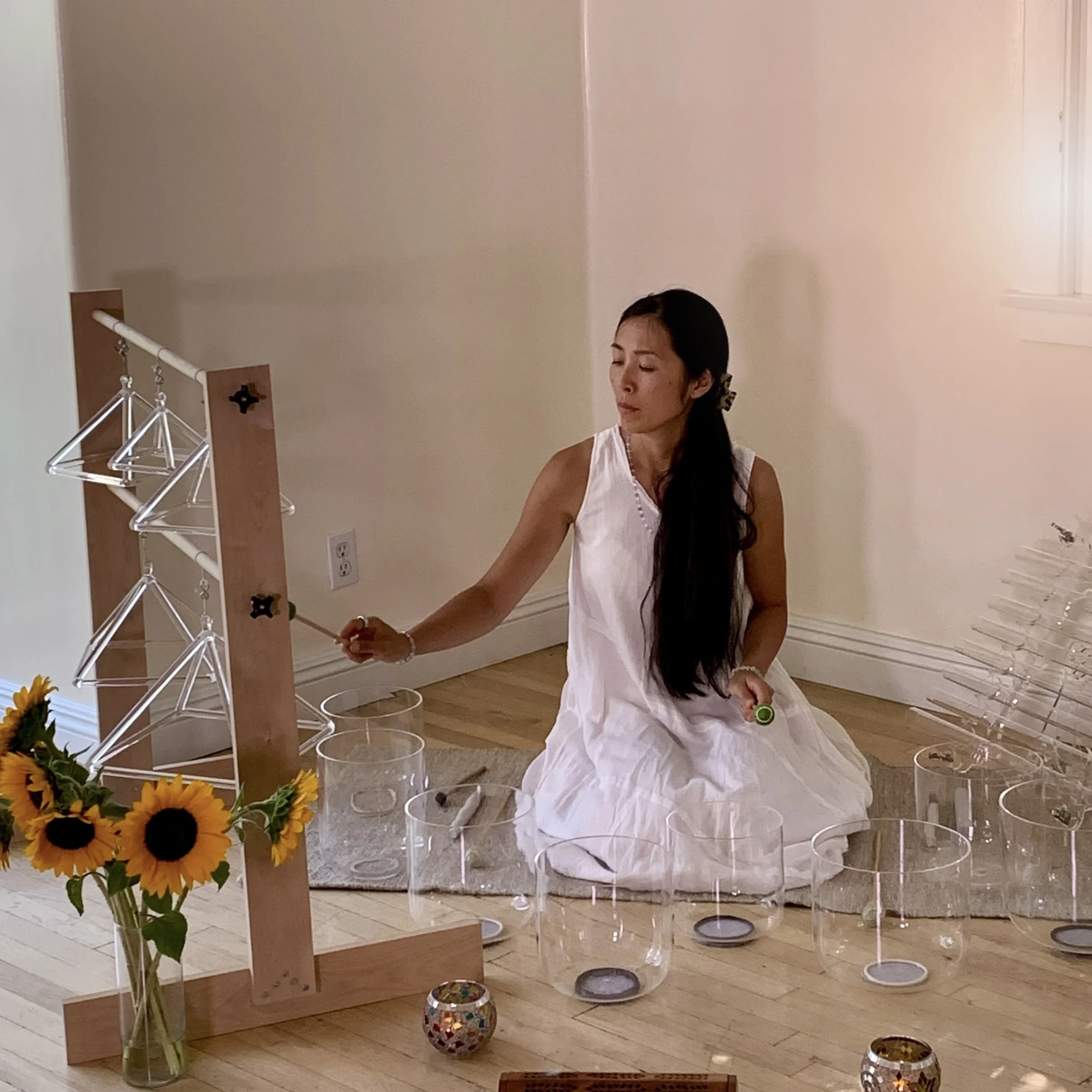 Seshen blends the pure tones of clear quartz crystal singing bowls, pyramids, and harp with her voice, composing music in the moment that is attuned to the group’s energy and intention.